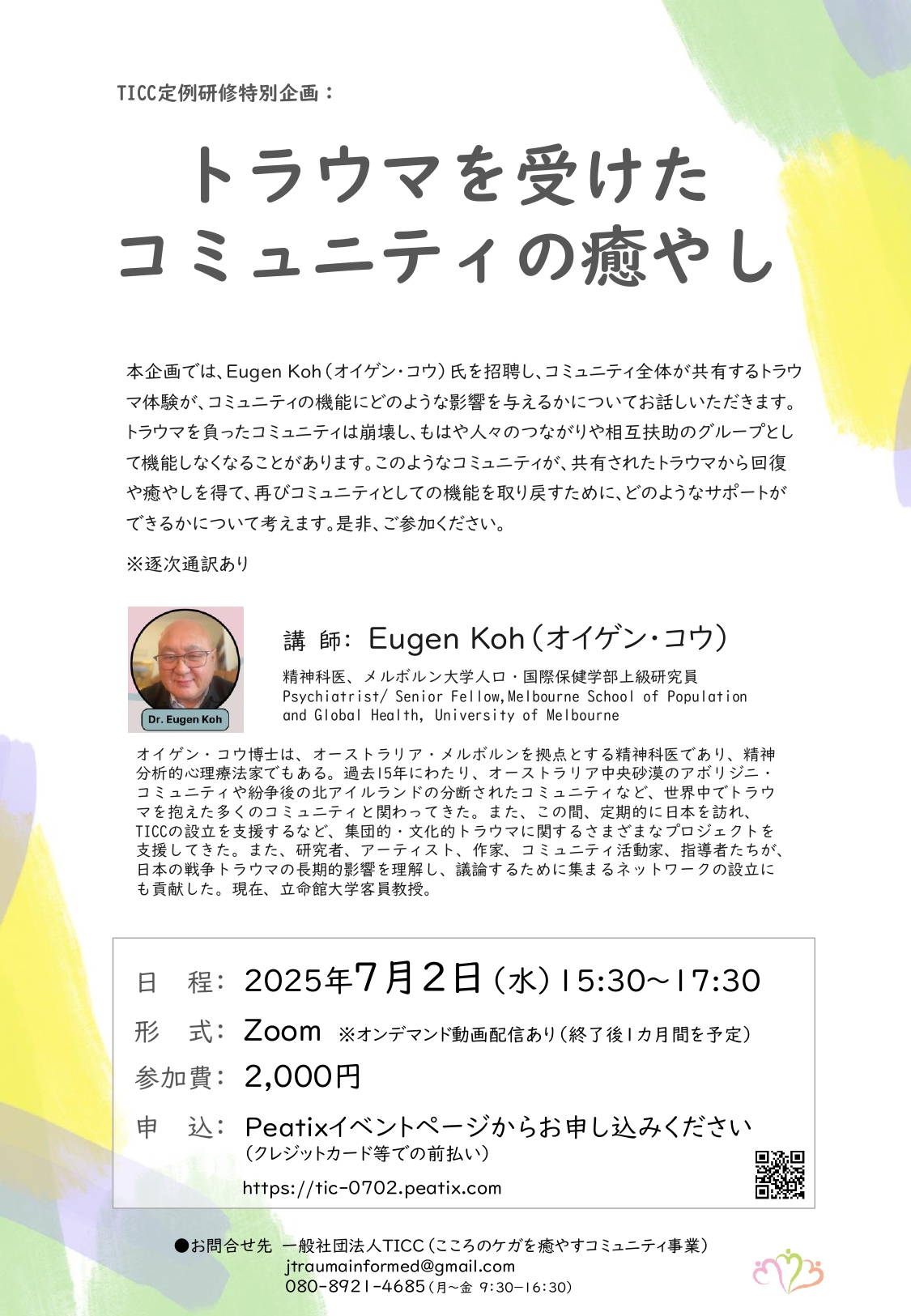 トラウマインフォームドに関係する研修会,TICC主催の研修会情報です.TICC独自研修,共催研修がございます.ご参加をお待ちしております.
